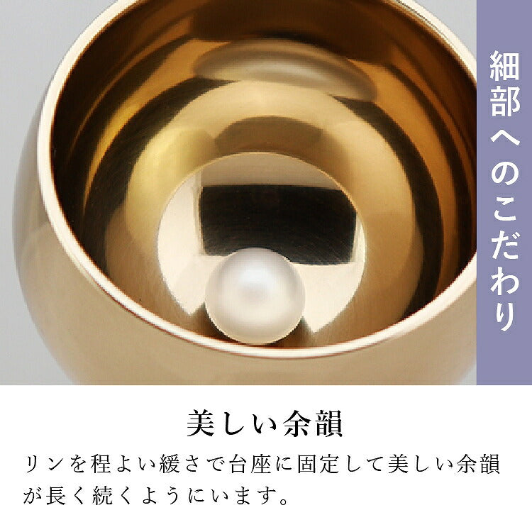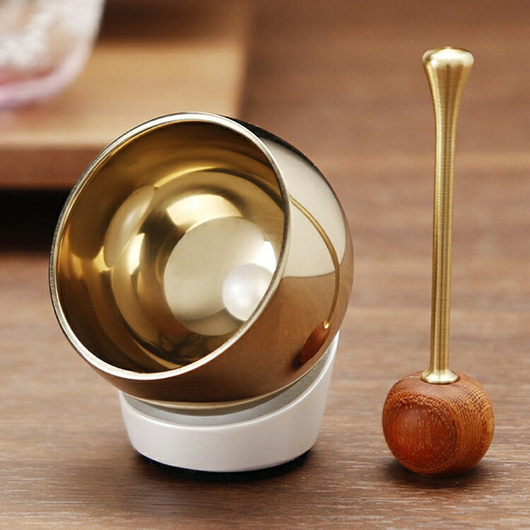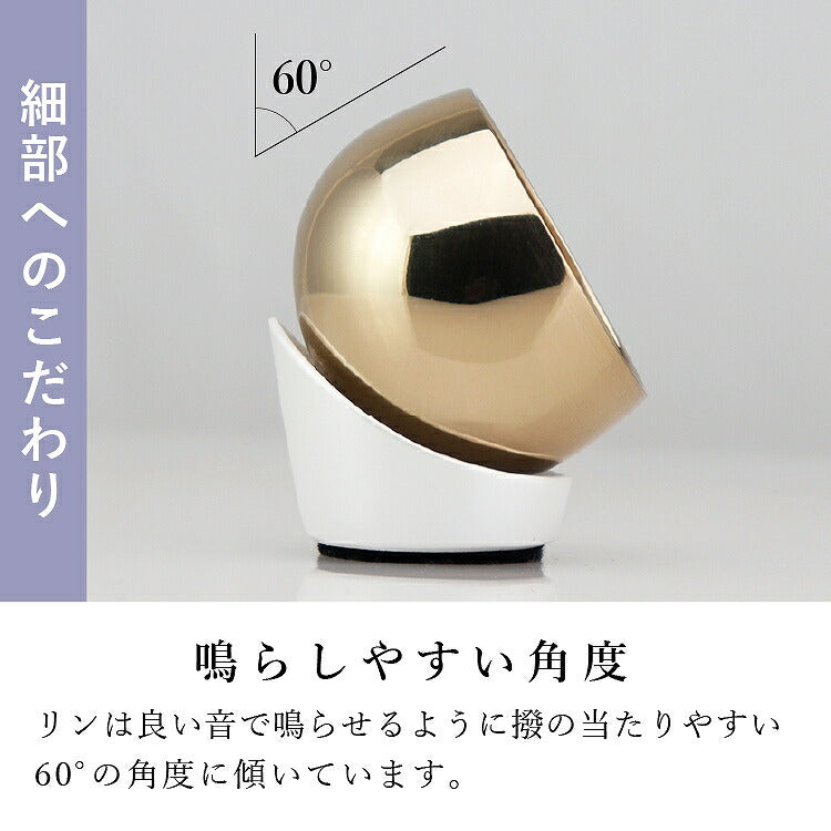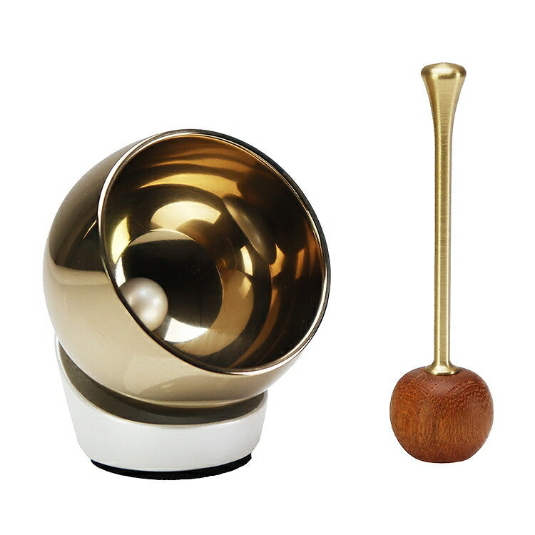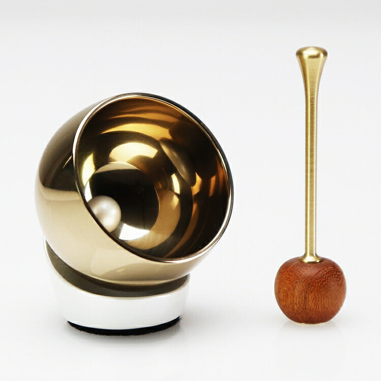 おりんとりん棒のセットです。小首を傾げる宇宙飛行士のイメージ。おりんを鳴らしやすい角度に傾けて程よいゆるみで固定し、音色を長く響かせる工夫をしました。