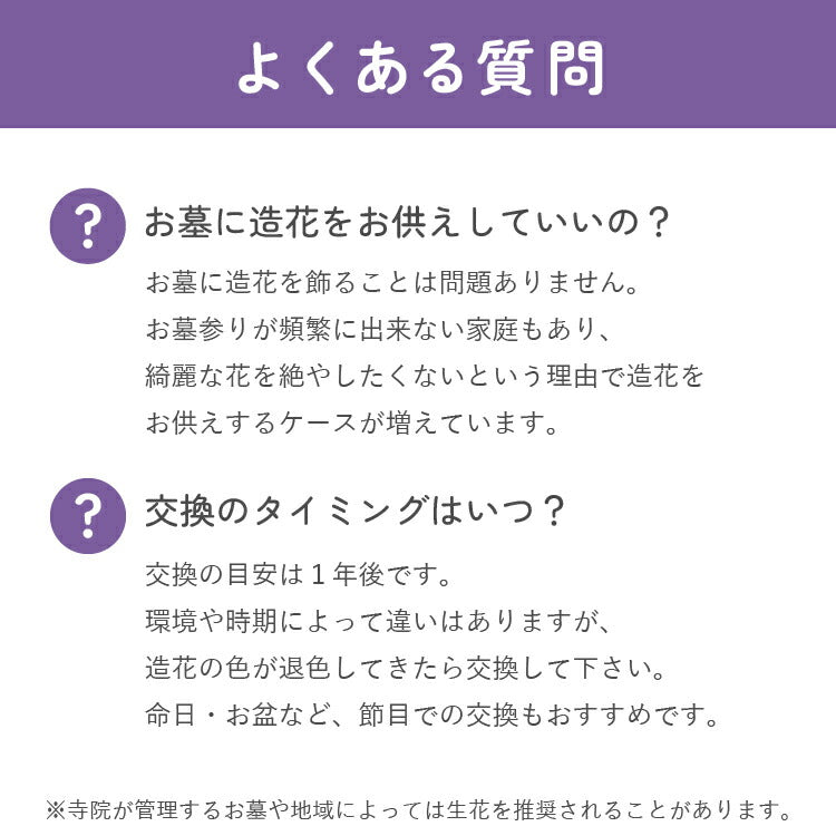 お墓にお供えする造花です。1対2束セット。花が枯れて見栄えが悪くなったり、虫やカラスに荒らされたりせず、いつも清潔でキレイな状態が長く続きます。