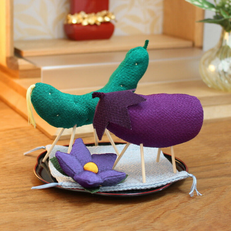 ちりめん細工のお盆飾り。ミニサイズでかわいい精霊馬セットです。初盆や新盆のお供え物として贈り物やギフトにおすすめ。イミテーションだから毎年飾れます。