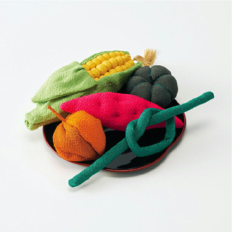 ちりめん細工のお盆飾り。ミニサイズでかわいい野菜セットです。初盆や新盆のお供え物として贈り物やギフトにおすすめ。イミテーションだから毎年飾れます。