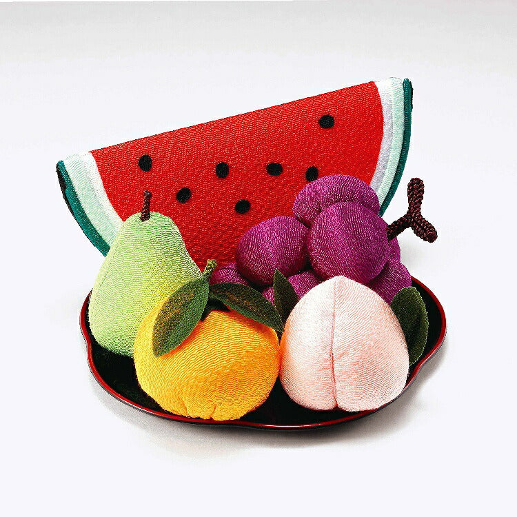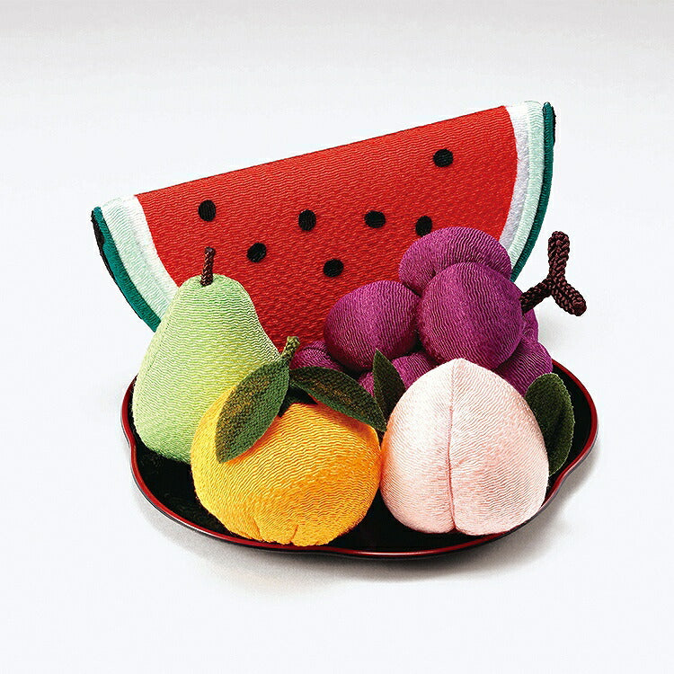 ちりめん細工のお盆飾り。ミニサイズでかわいい果物セットです。初盆や新盆のお供え物として贈り物やギフトにおすすめ。イミテーションだから毎年飾れます。