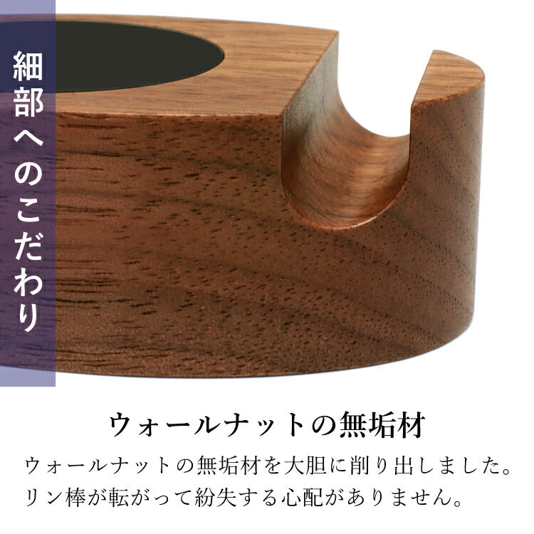 おしゃれなりん台です。無垢材のなめらかな手触りが心地よい日本製のモダン仏具。リン棒をくぼんだ溝に置いてひとまとめにできます。おりんとりん棒は別売りです。