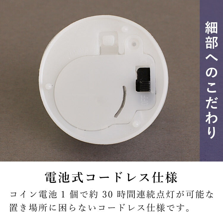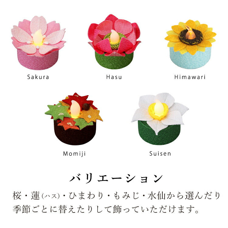 電池式LEDろうそくです。ちりめん細工のかわいい花が光ります。コードレスで小さいから飾りやすく、仏壇の灯りとしてお盆やお彼岸、季節の移ろいを演出します。