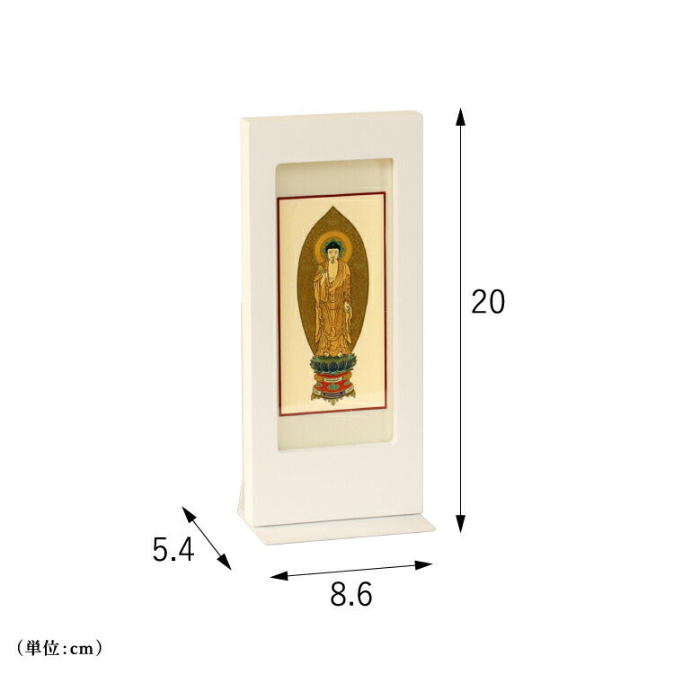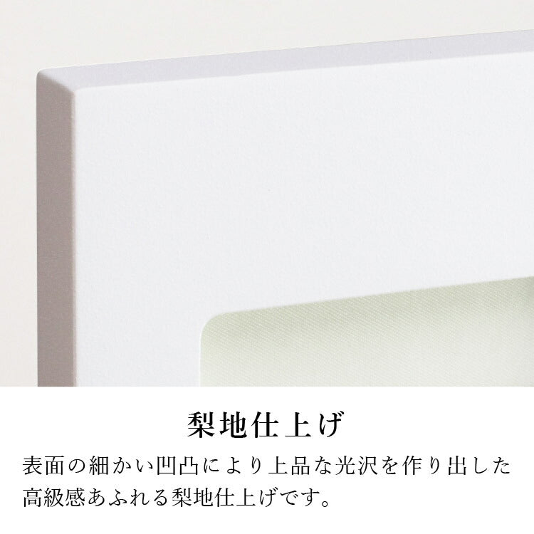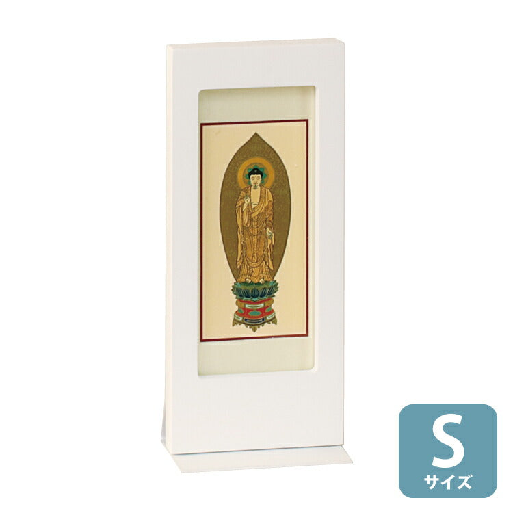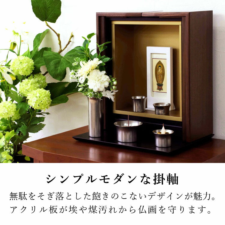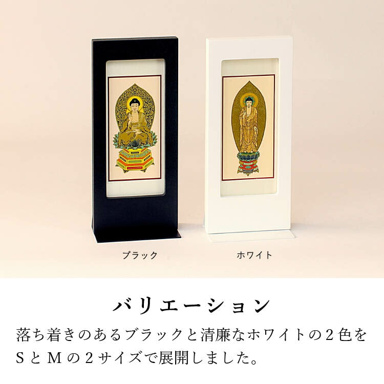おしゃれなモダン掛軸です。日本製のシンプルなフレームは表面に細かな凹凸を施して上質感のある仕上がり。自立型だから安置が簡単でモダン仏壇にぴったりです。