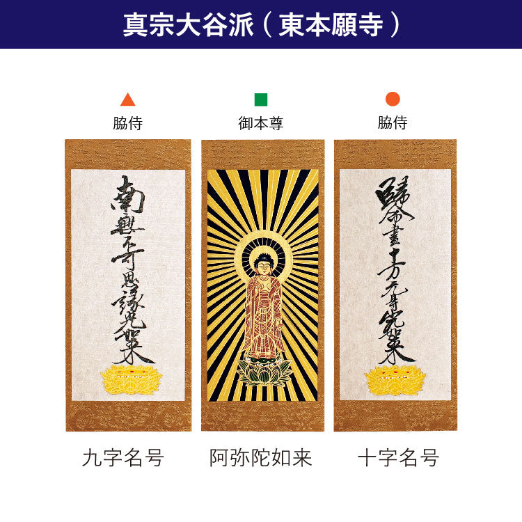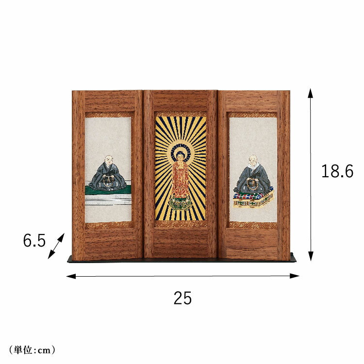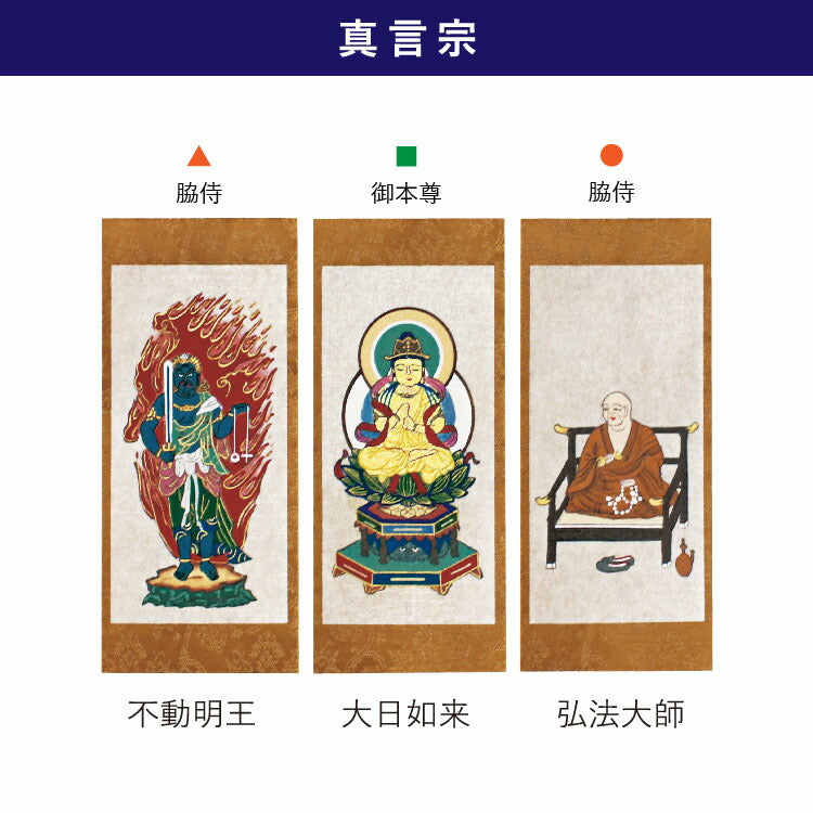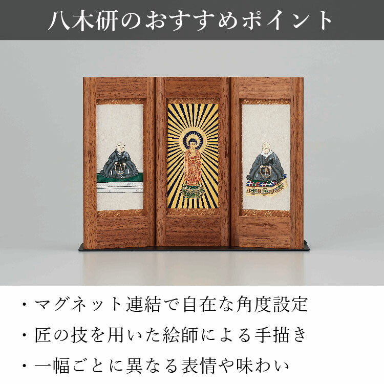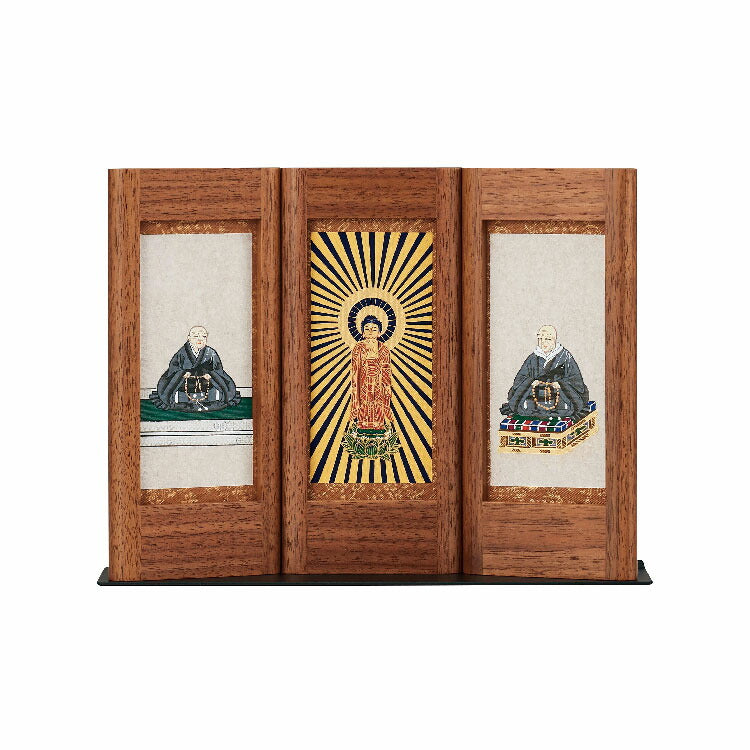 おしゃれなモダン掛軸の三尊仏セット。京都の絵師が丁寧に手描きした仏画を日本製のフレームに収めました。自立型だから安置が簡単でモダン仏壇にぴったりです。