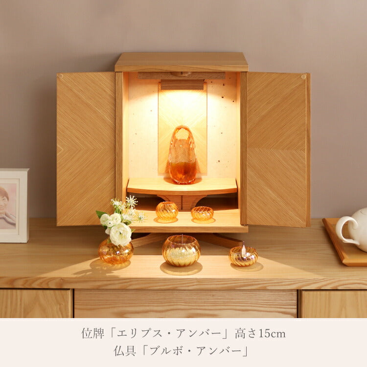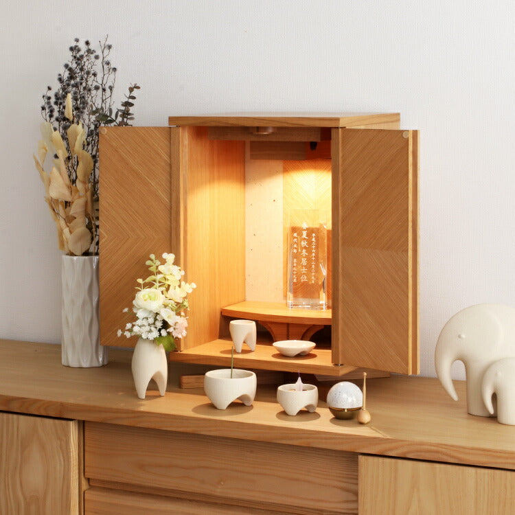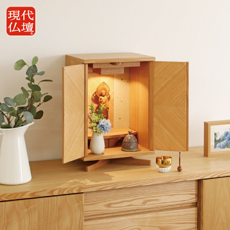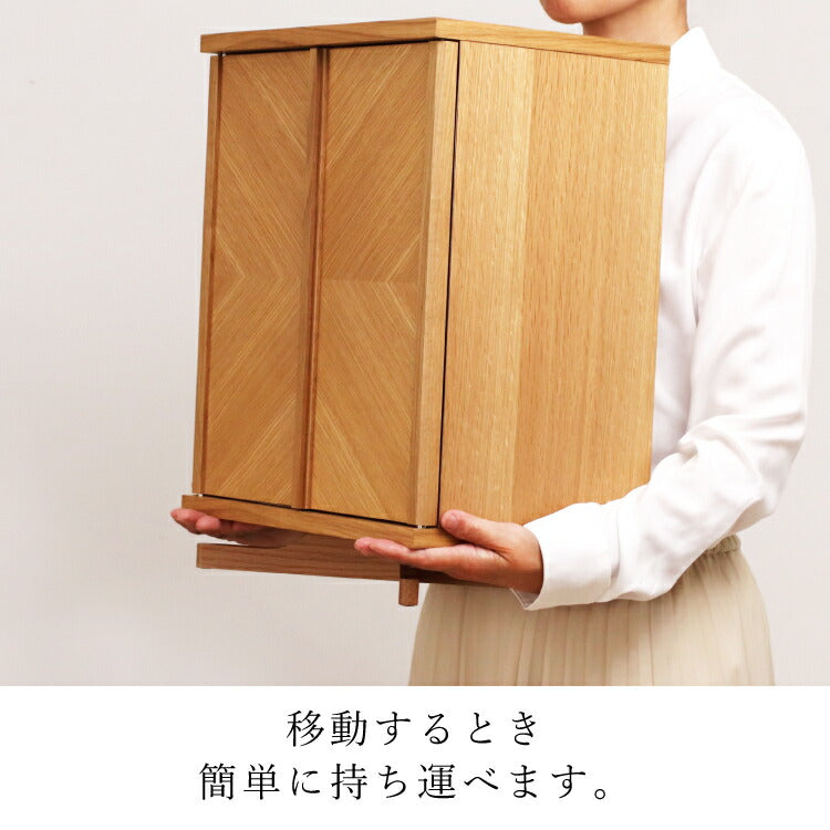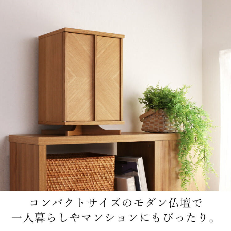矢貼り模様がおしゃれなモダン仏壇です。リビングやマンションに置きやすいミニ仏壇。小さいながら日本製ならではきめ細やかな作りで、手元供養にもおすすめです。