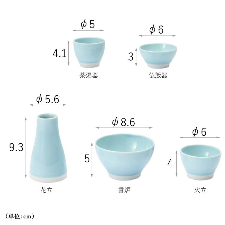 おしゃれなモダン仏具です。伝統工芸「有田焼」の日本製5点仏具セット。淡い色味はモダン仏壇に合わせやすく、限界まで薄く削り出して繊細に美しく仕上げました。