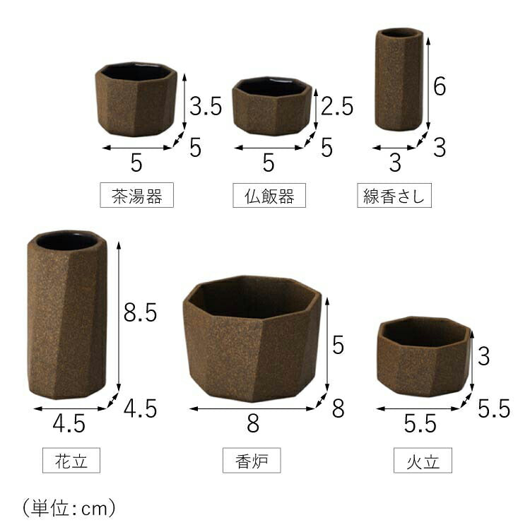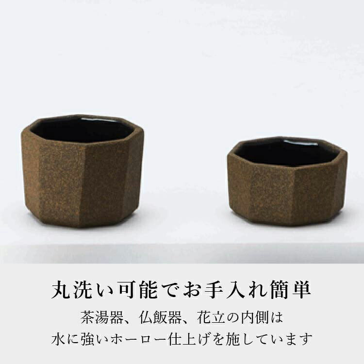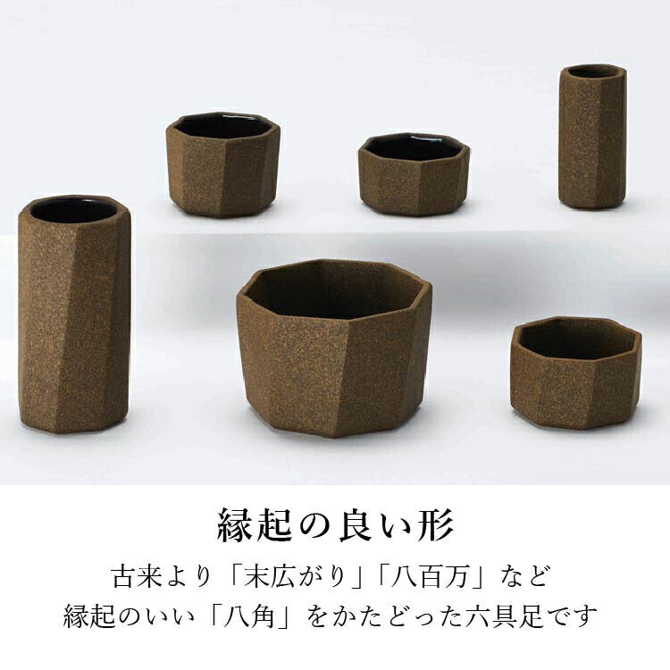 おしゃれなモダン仏具です。伝統工芸「山形鋳物」の日本製6点仏具セット。縁起が良いとされる八角形をかたどった薄くきめ細かな鋳肌に風格が感じられます。