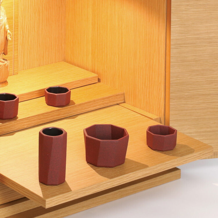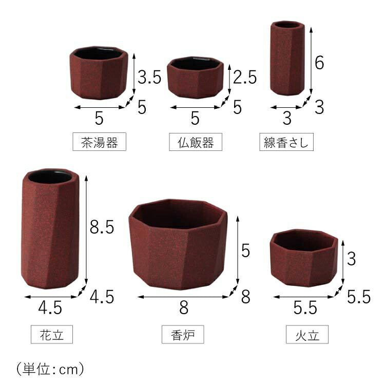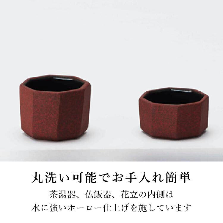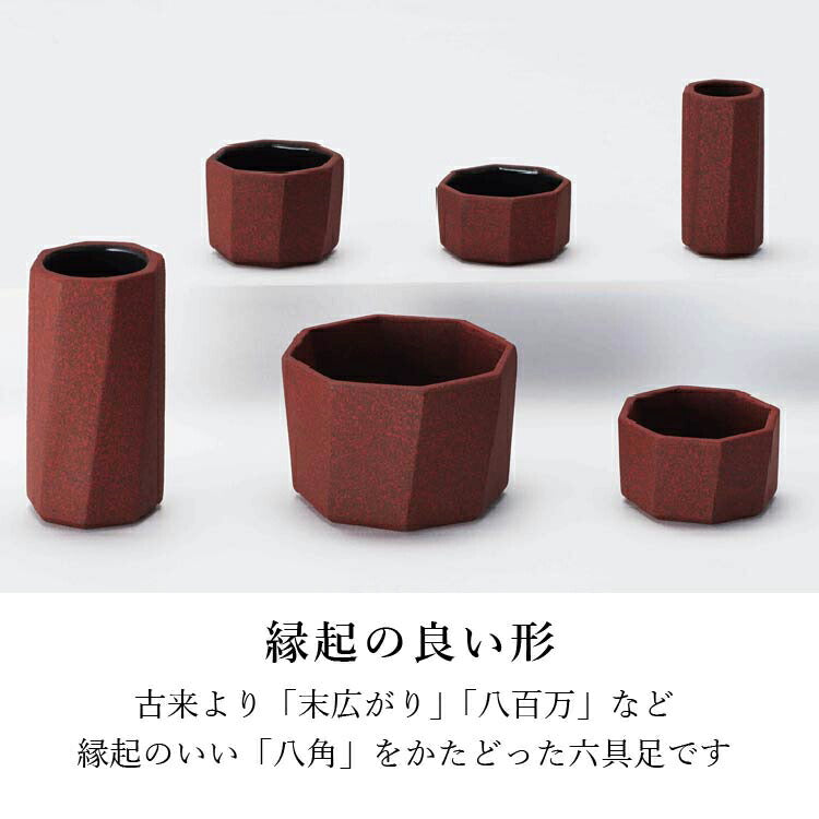 おしゃれなモダン仏具です。伝統工芸「山形鋳物」の日本製6点仏具セット。縁起が良いとされる八角形をかたどった薄くきめ細かな鋳肌に風格が感じられます。