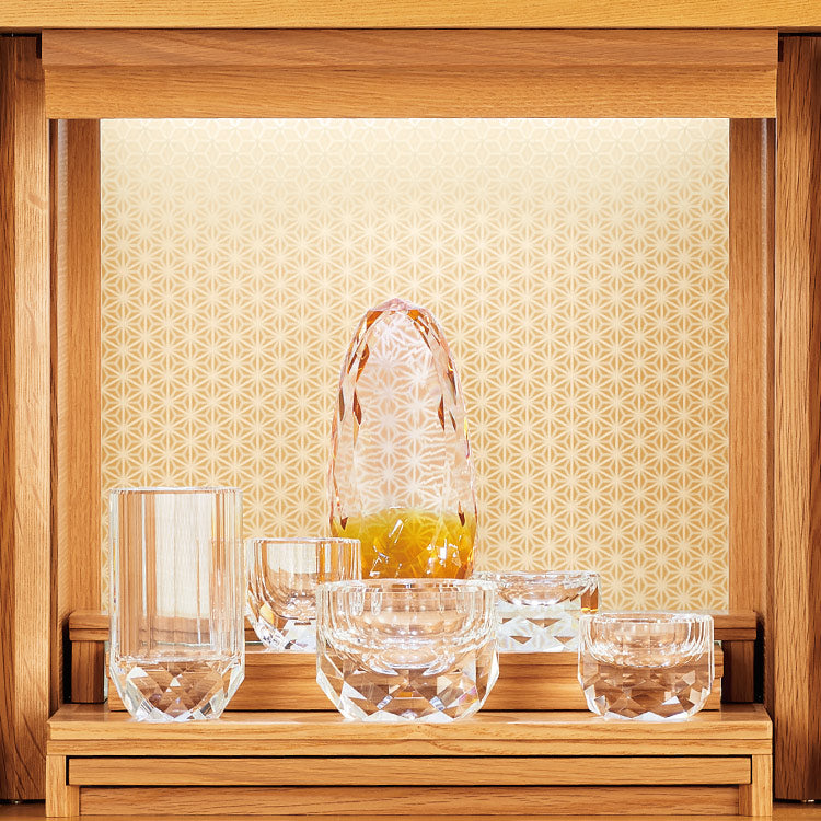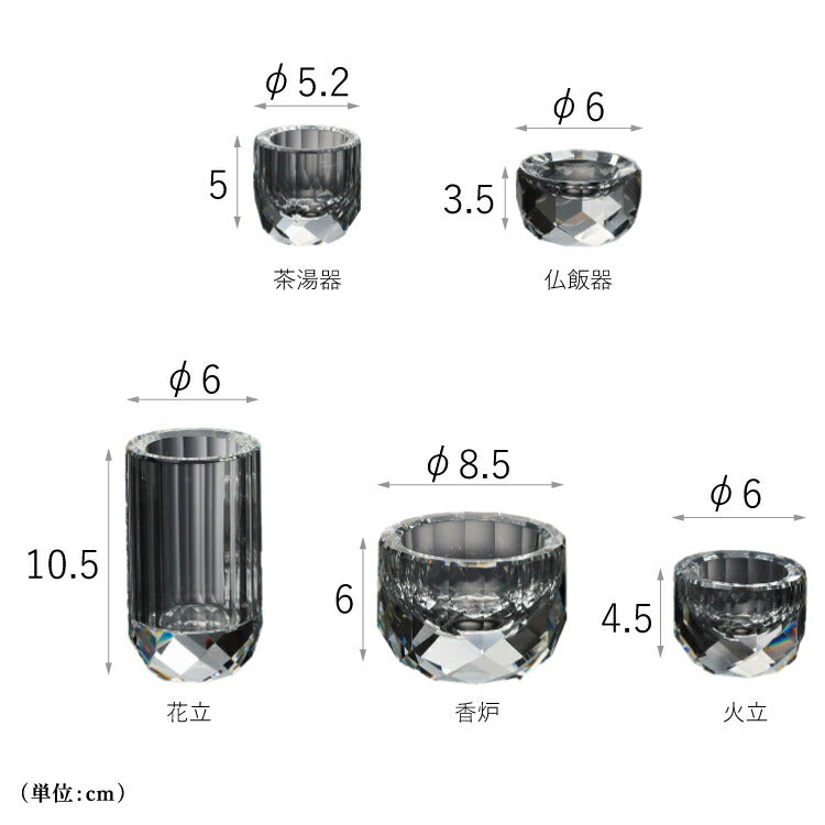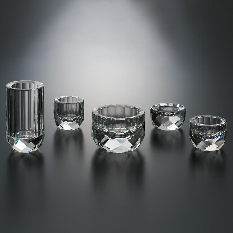 おしゃれなモダン仏具です。透明度と高い屈折率がある光学ガラスで制作された5点仏具セット。光学ガラスの美しい輝きがモダン仏壇に高級感をプラスします。