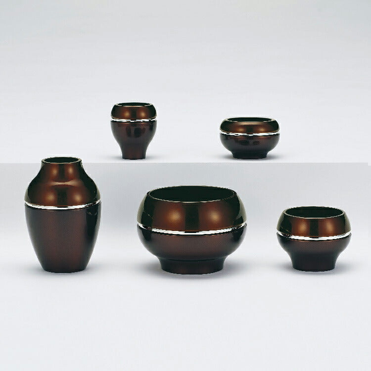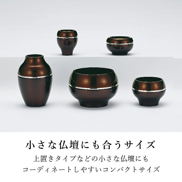 おしゃれなモダン仏具です。伝統工芸「高岡銅器」の日本製5点仏具セット。ふたつの異なる光沢と銀色の輝きがモダン仏壇に映えてワンランク上の空間を演出します。