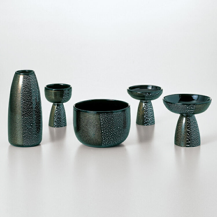 おしゃれなモダン仏具です。イタリアの職人がハンドメイドで制作したヴェネチアンガラス製の5点仏具セット。金箔と銀箔の輝きがモダン仏壇を華やかに彩ります。