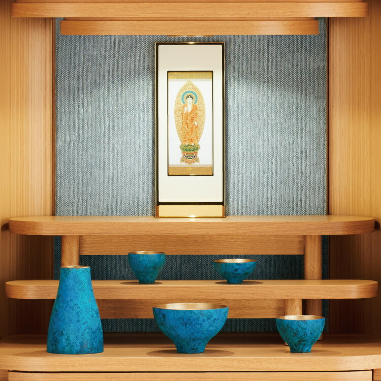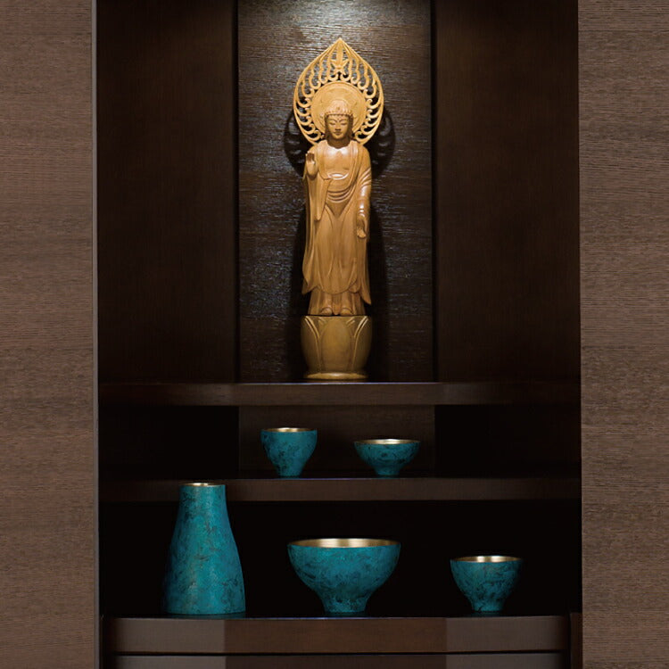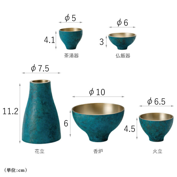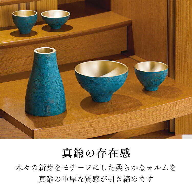おしゃれなモダン仏具です。伝統工芸「高岡銅器」の日本製5点仏具セット。趣のある色はモダン仏壇になじみやすく、時とともに自然と風合いが増していきます。
