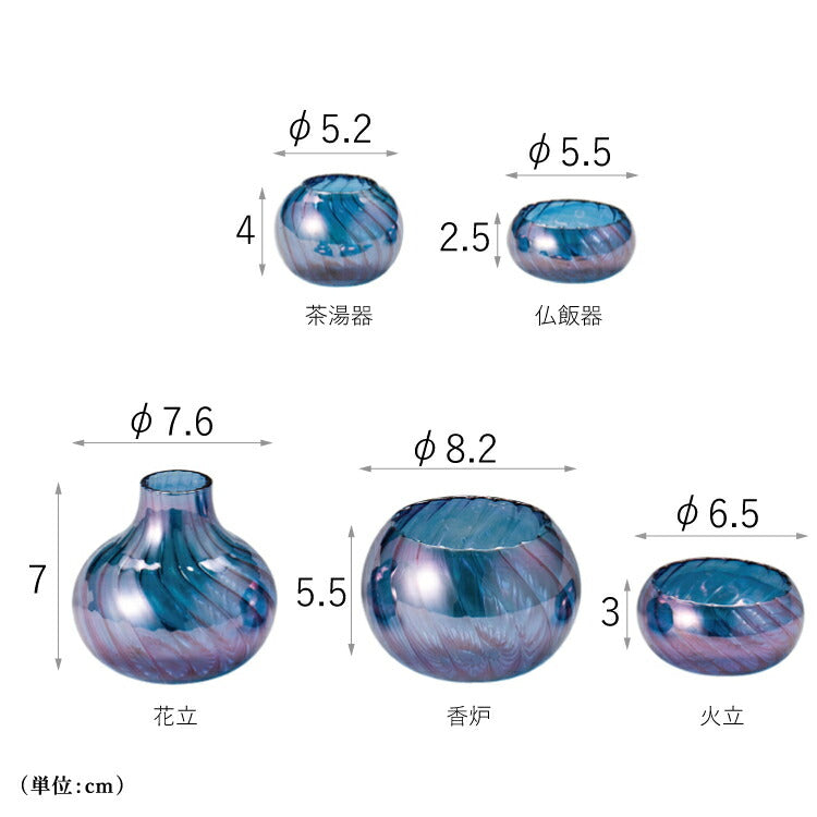 おしゃれなモダン仏具です。イタリアの職人がハンドメイドで制作した5点仏具セット。耐熱ガラスなので温かいお茶を直接入れられます。丸くてかわいい形が人気。