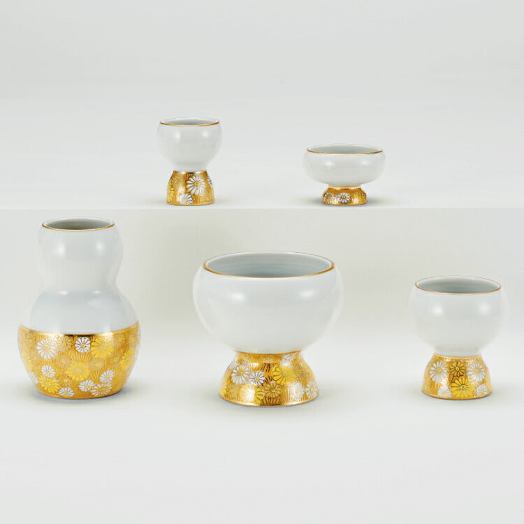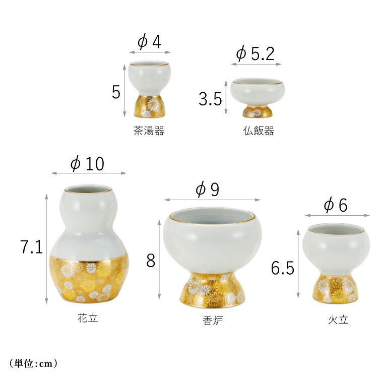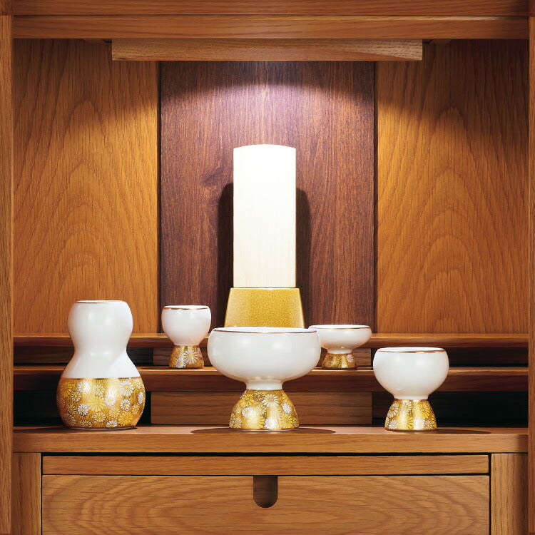 おしゃれなモダン仏具です。伝統工芸「九谷焼」の日本製5点仏具セット。職人が花詰の技法で一輪ずつ描き上げました。上品な金彩がモダン仏壇を華やかに彩ります。