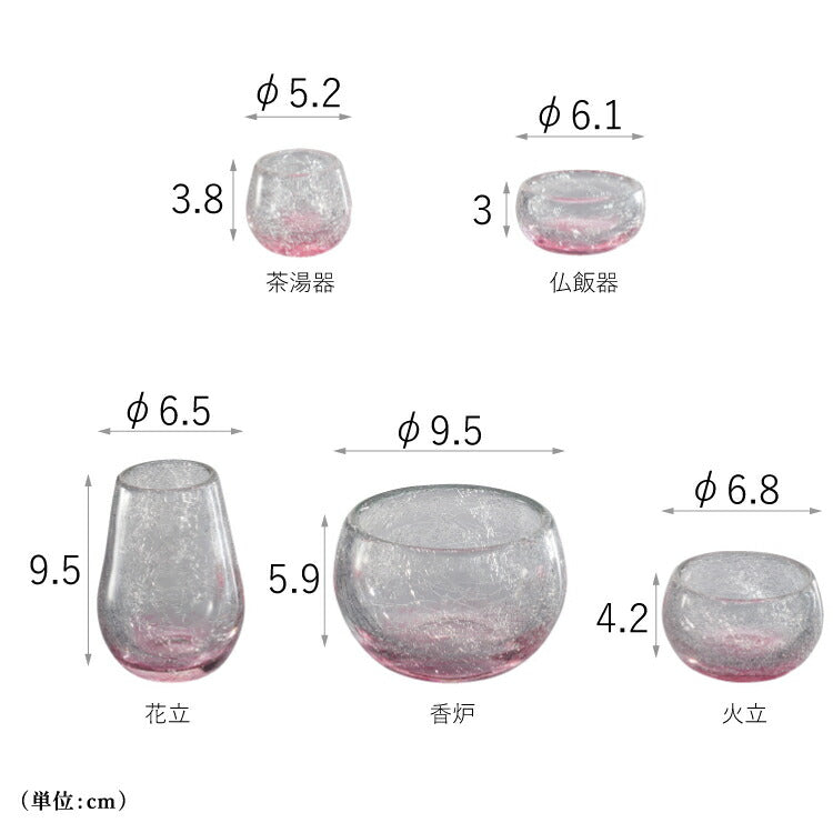 おしゃれなモダン仏具です。萩ガラスの職人がハンドメイドで制作した日本製5点仏具セット。他にない三層構造の内ひび貫入ガラスがモダン仏壇に輝きを放ちます。