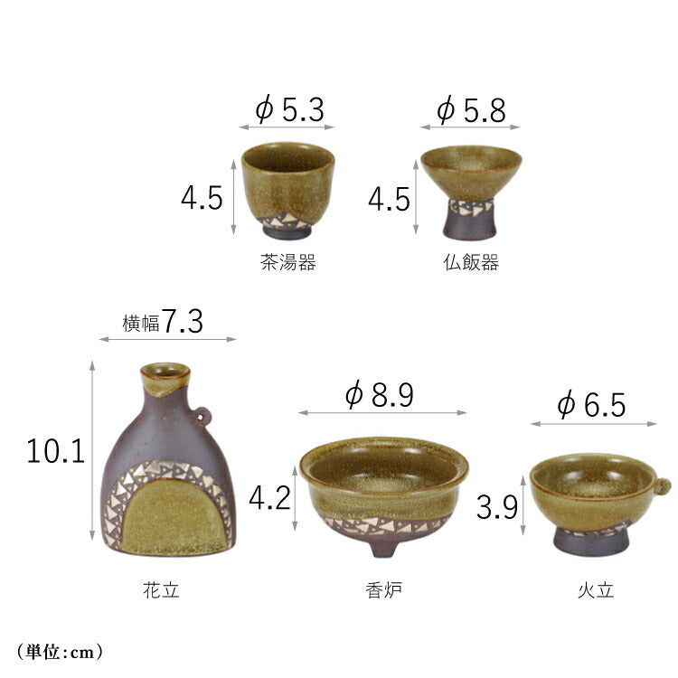 おしゃれなモダン仏具です。陶芸家が一つひとつ丁寧に制作した日本製5点仏具セット。素朴でモダン仏壇に合わせやすく、唯一無二の色味とかわいい模様が特長です。