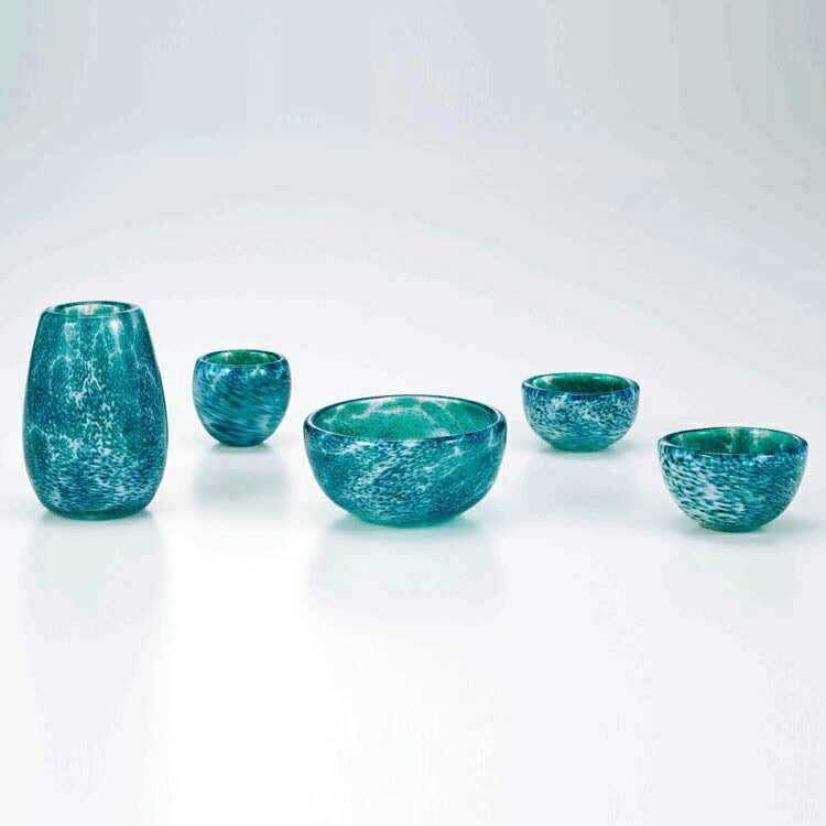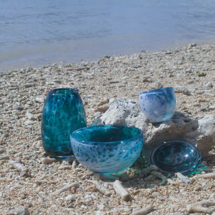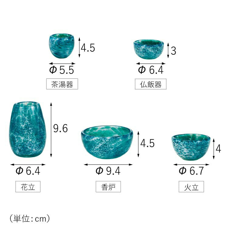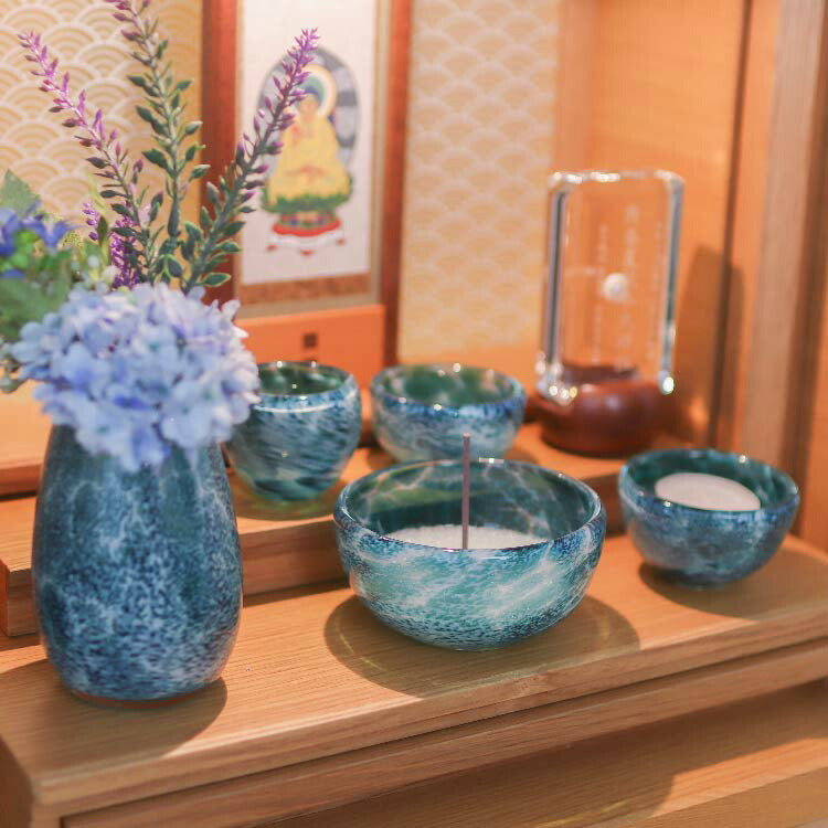 おしゃれなモダン仏具です。沖縄県工芸士による日本製5点仏具セット。海をそのまま形にしたような琉球ガラスがモダン仏壇に映えて静かなやすらぎを感じさせます。