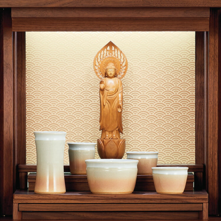 おしゃれなモダン仏具です。伝統工芸「萩焼」の日本製5点仏具セット。素朴で柔らかな風合いはモダン仏壇に合わせやすく使うほど変化して味わいが増していきます。
