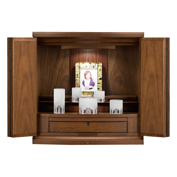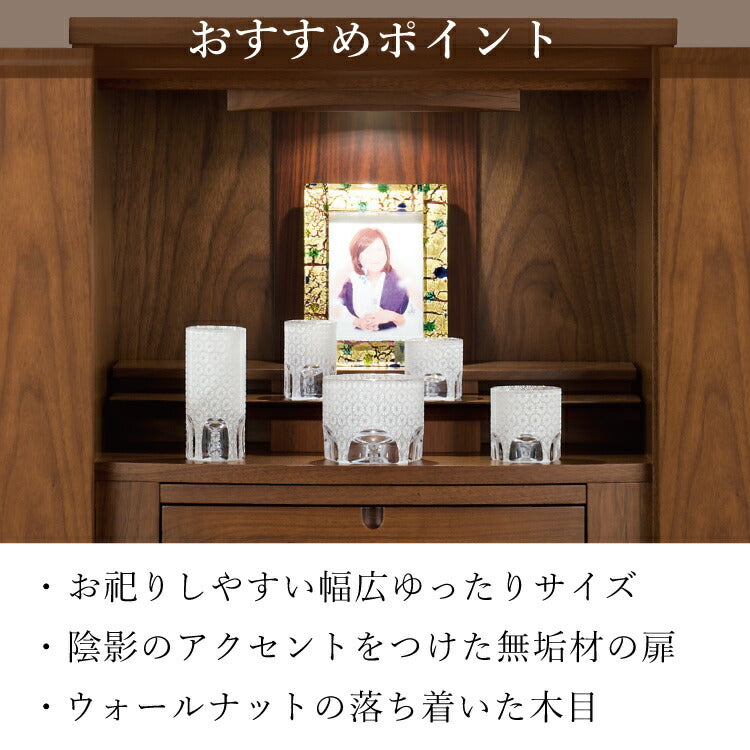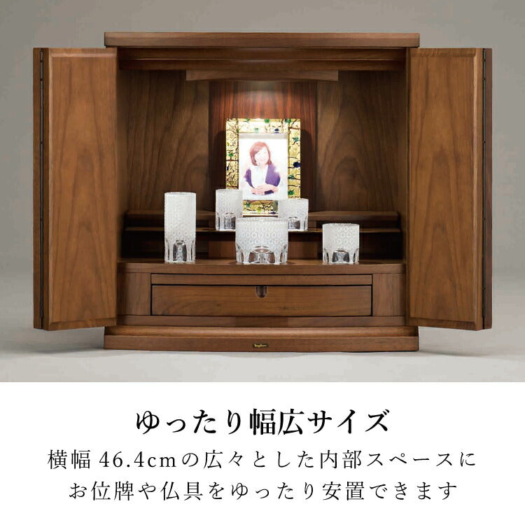 おしゃれなモダン仏壇です。コンパクトな上置き仏壇ながら、横幅がゆったりと広くて使いやすく、滑らかな無垢材の扉に日本製の丁寧な物づくりが感じられます。