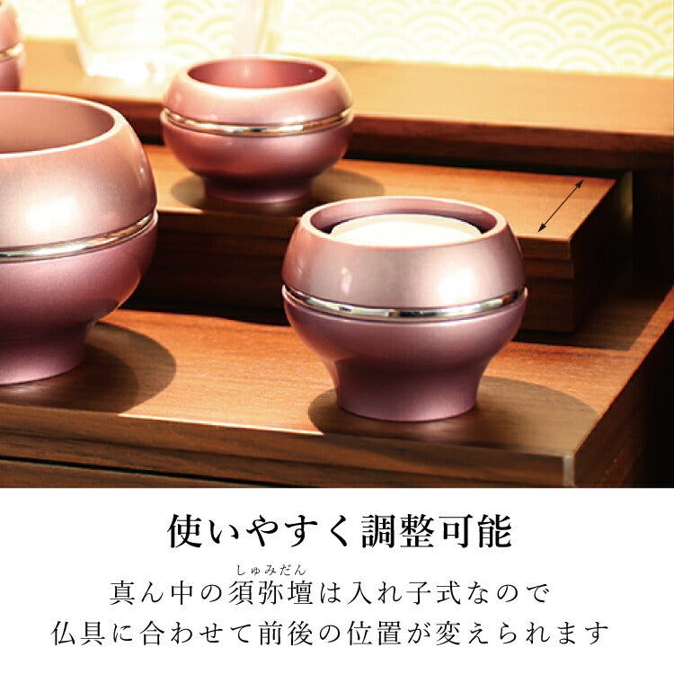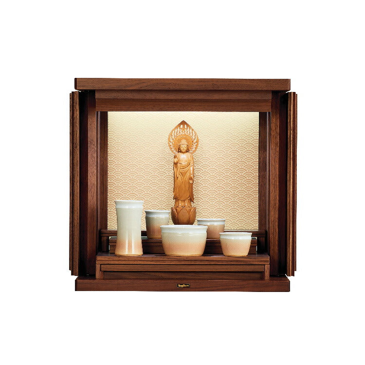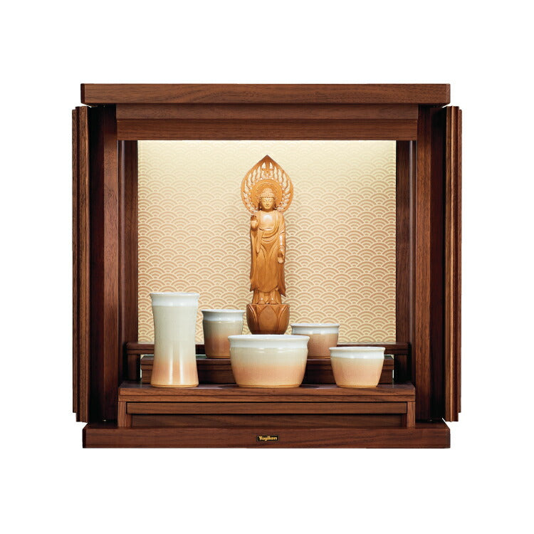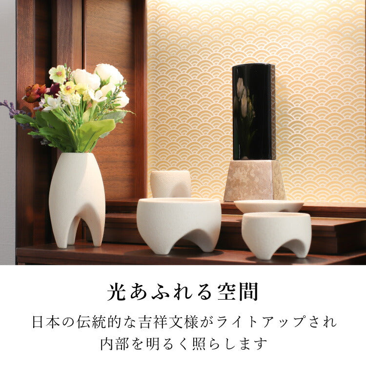 おしゃれなモダン仏壇です。扉が両側に収まるコンパクトな上置き仏壇なのでリビングやマンションに置きやすく、日本製ならではの和柄にぬくもりが感じられます。