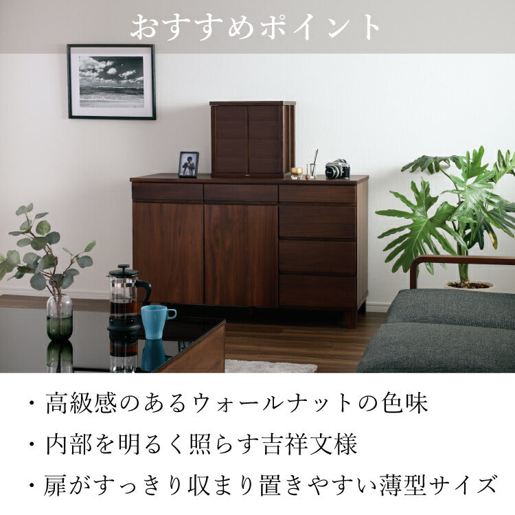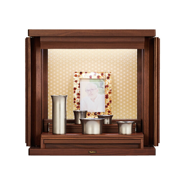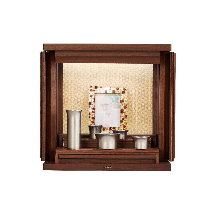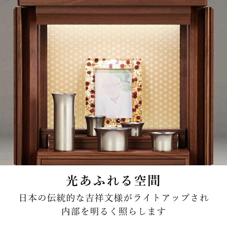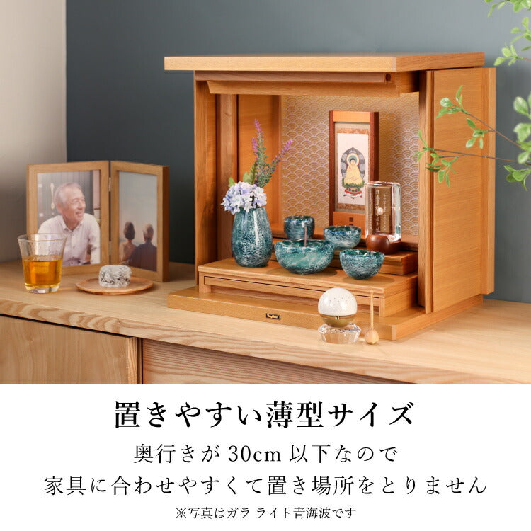 おしゃれなモダン仏壇です。扉が両側に収まるコンパクトな上置き仏壇なのでリビングやマンションに置きやすく、日本製ならではの和柄にぬくもりが感じられます。