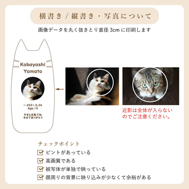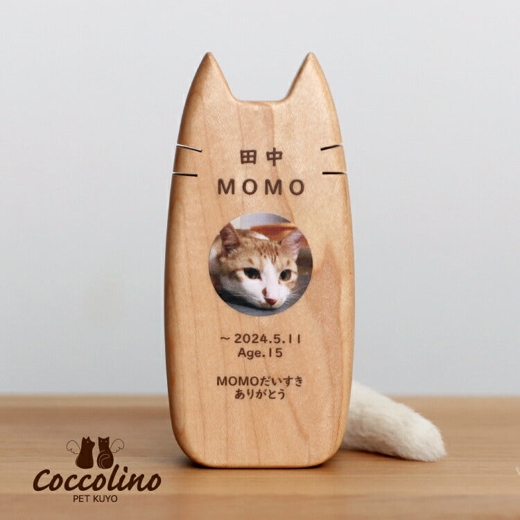 かわいい猫型のペット位牌です。小さいので仏壇や骨壺、メモリアルグッズのそばに置きやすく、大切なネコちゃんを本格的にペット供養できます。名入れ代込み。