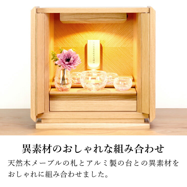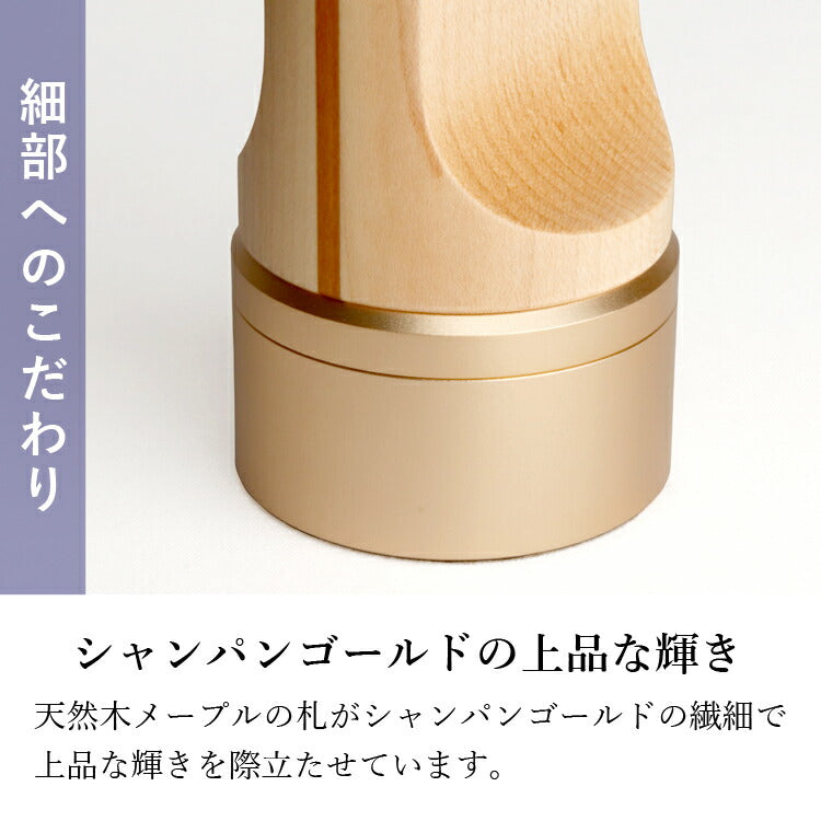 おしゃれでモダン位牌です。シャンパンゴールドの台座内部に小さな品を納められます。夫婦位牌の名入れもできるのでミニ仏壇やコンパクトな手元供養にも最適です。