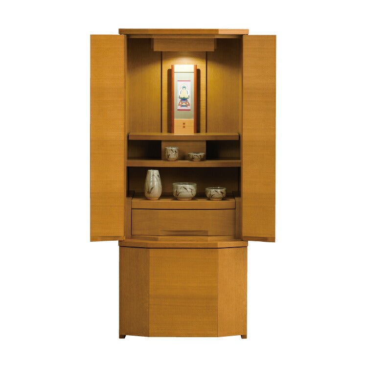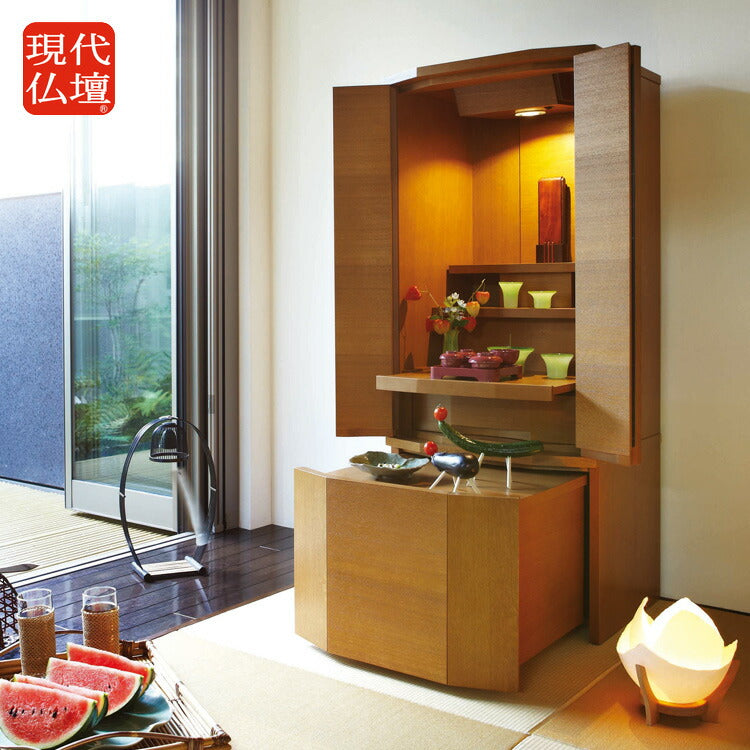 おしゃれなモダン仏壇です。リビングやマンションに置きやすく、日本製ならではの浮造りや引出し兼経机、仏具をのせて動かせる須弥壇など機能性に優れています。