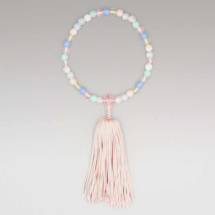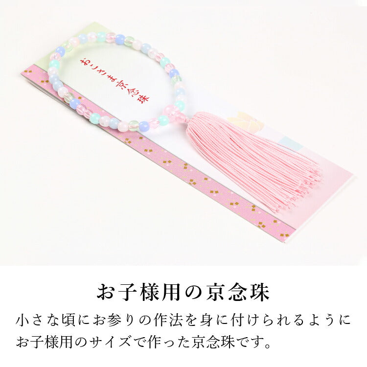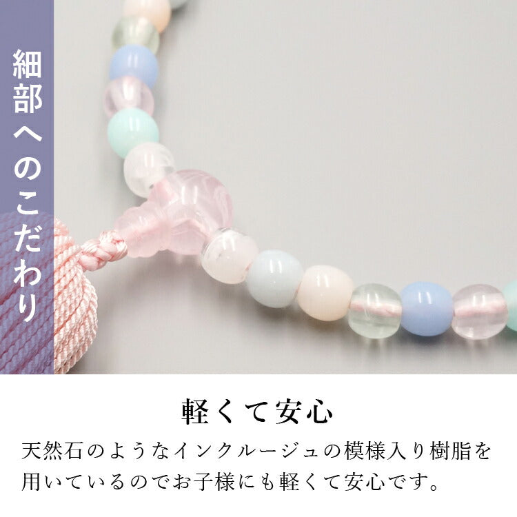 全ての宗派でお使いいただけるお子様用略式数珠です。京都の職人が手作りした「京念珠」なので丈夫で美しい仕上がり。天然石を模した樹脂製で軽くて安心です。