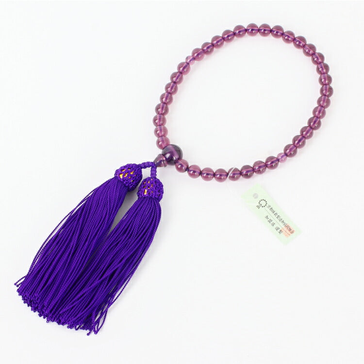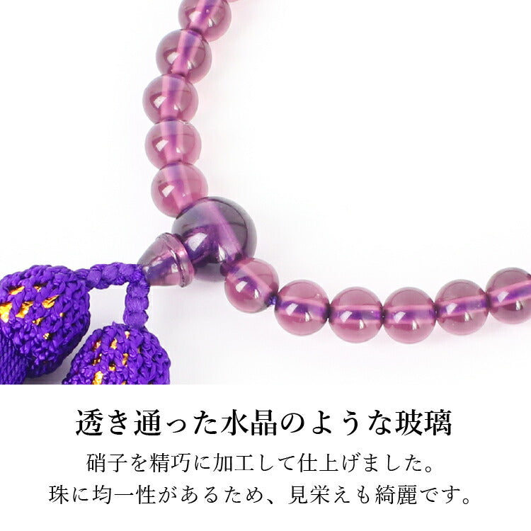 全ての宗派でお使いいただける女性用略式数珠です。京都の職人が手作りした「京念珠」なので丈夫で美しい仕上がり。透明感のある紫色のガラスが上品に輝きます。