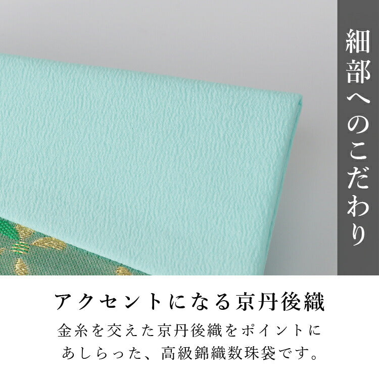 全ての宗派でお使いいただける数珠袋。数珠・念珠を入れて保管したり携帯したりするケースです。京丹後織が華やかでおしゃれ。留め具のない折りたたむ仕様です。