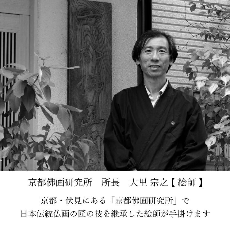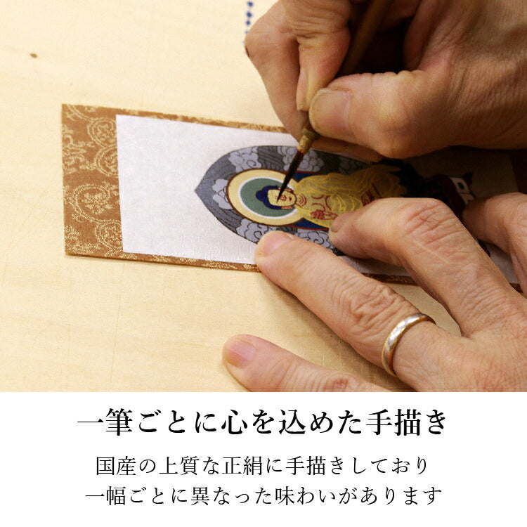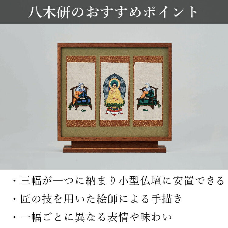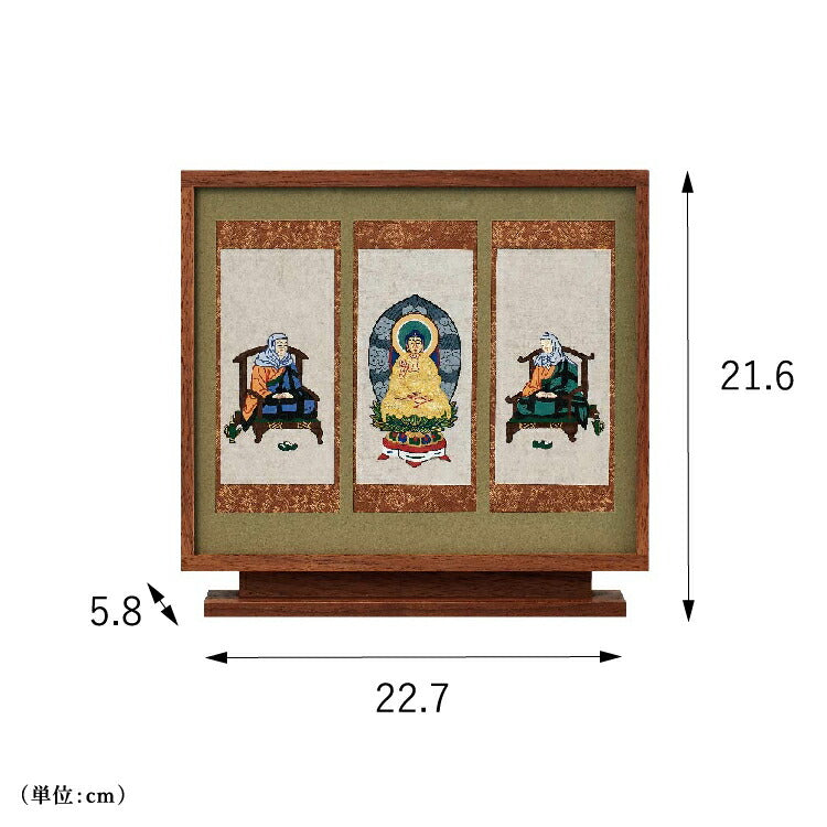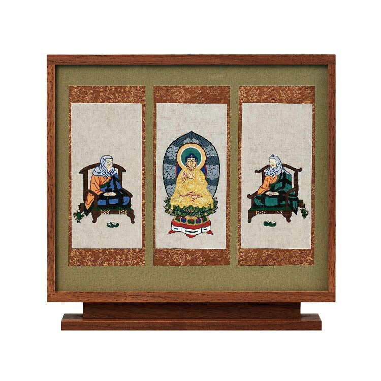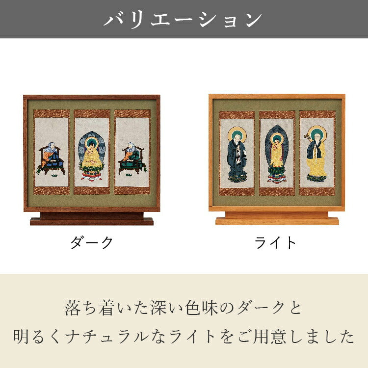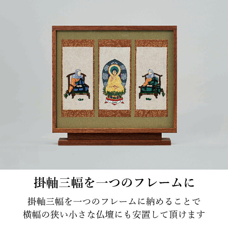 おしゃれなモダン掛軸の三尊仏セット。京都の絵師が丁寧に手描きした仏画を日本製のフレームに収めました。自立型だから安置が簡単でモダン仏壇にぴったりです。