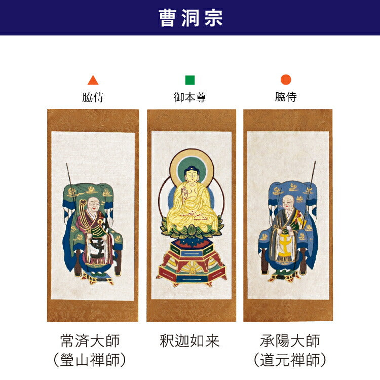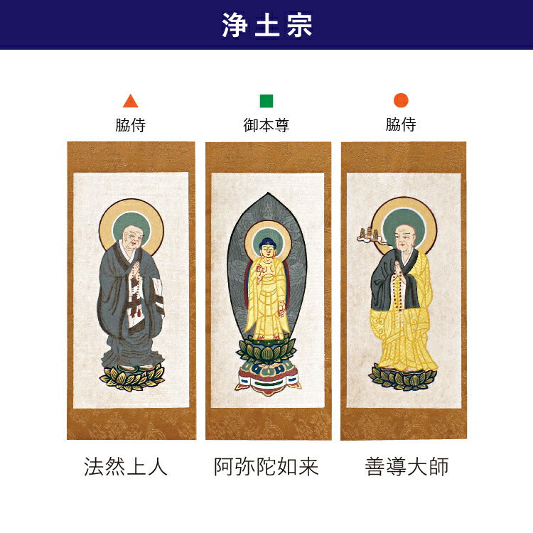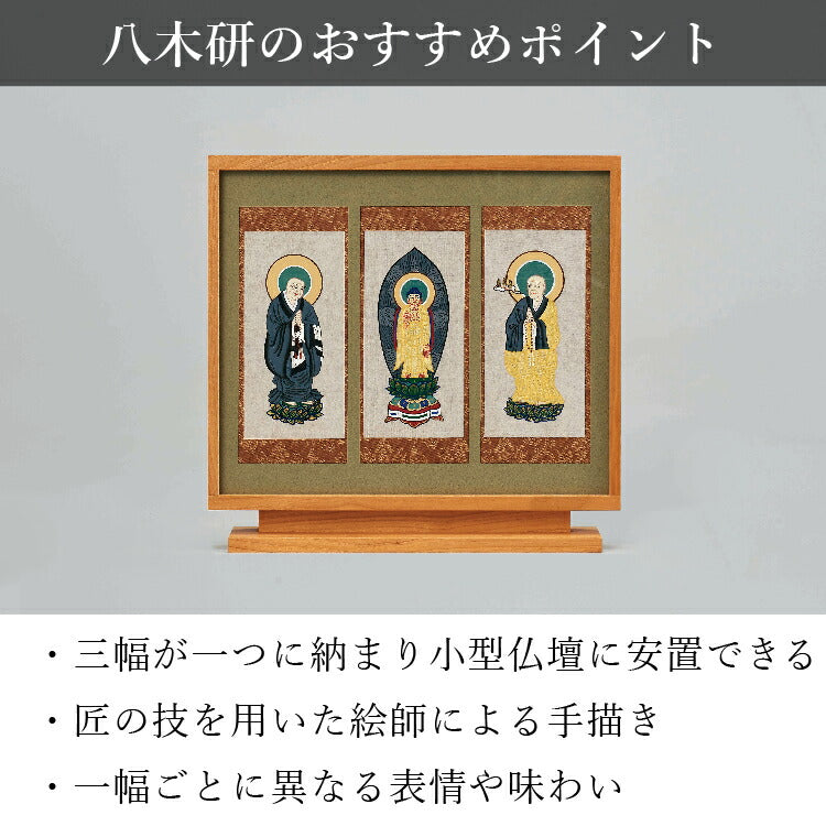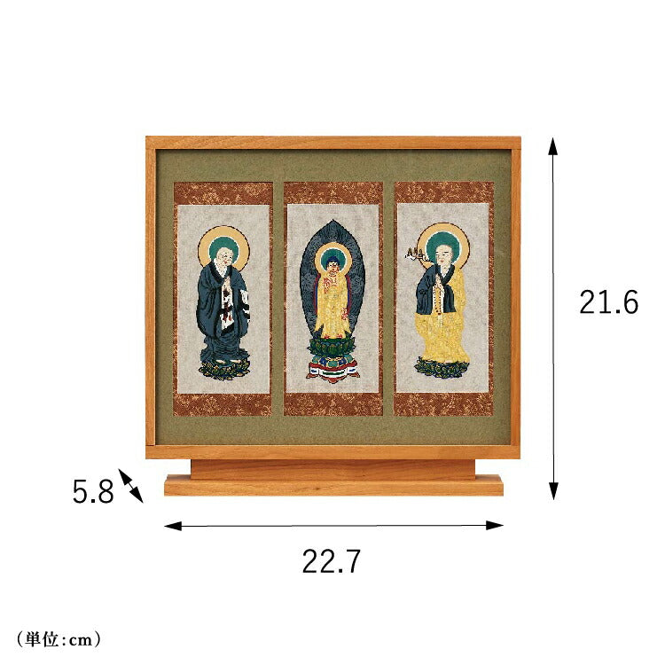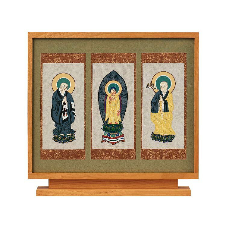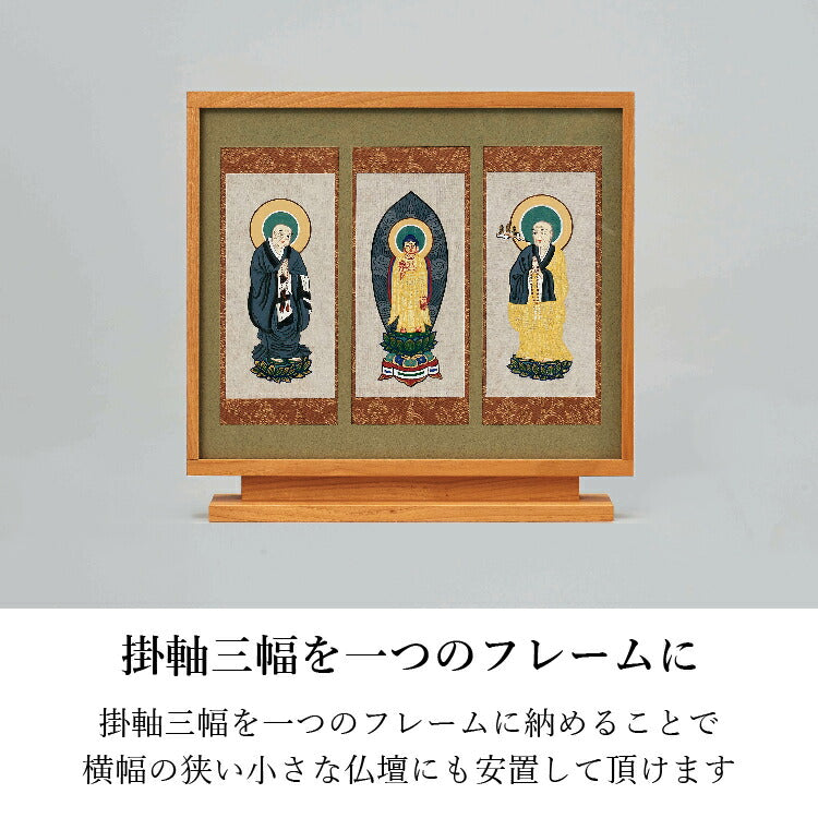 おしゃれなモダン掛軸の三尊仏セット。京都の絵師が丁寧に手描きした仏画を日本製のフレームに収めました。自立型だから安置が簡単でモダン仏壇にぴったりです。