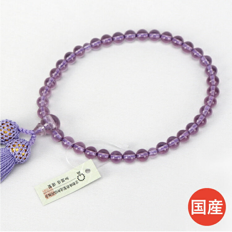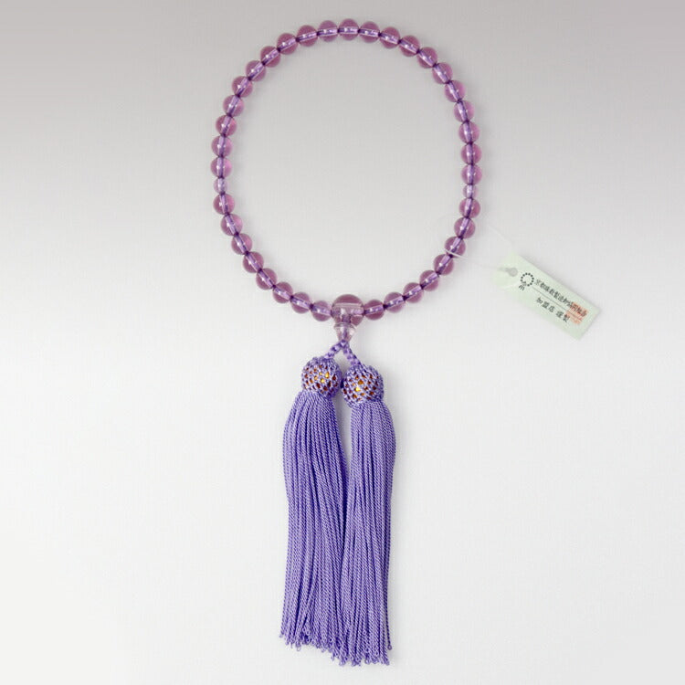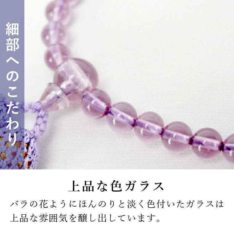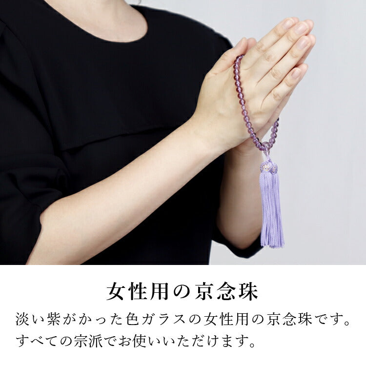 全ての宗派でお使いいただける女性用略式数珠です。京都の職人が手作りした「京念珠」なので丈夫で美しい仕上がり。透明な淡い紫色のガラスが上品に輝きます。