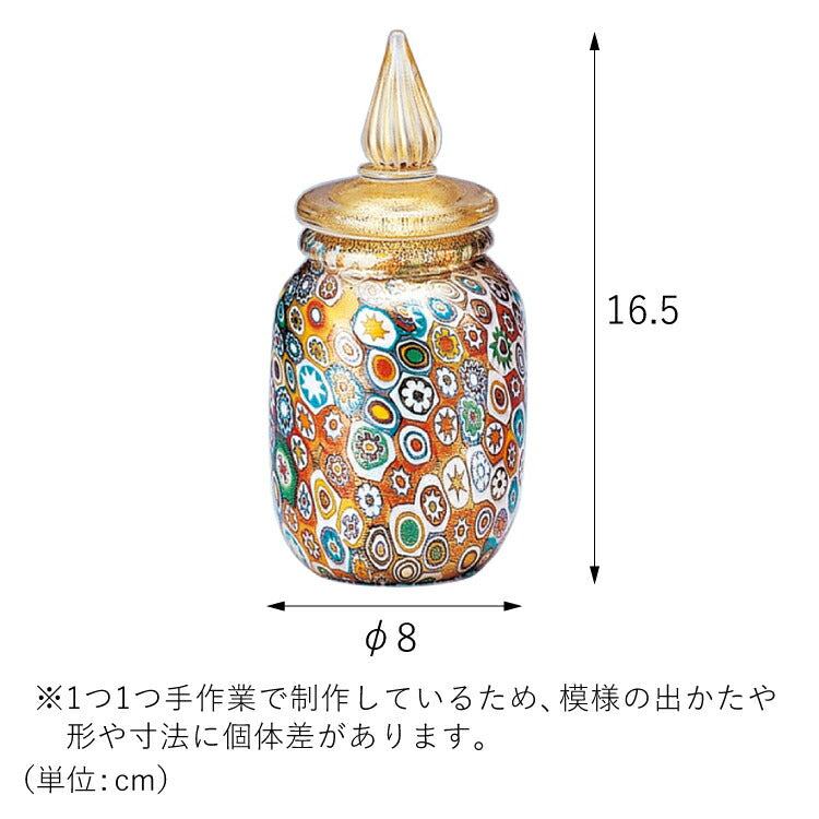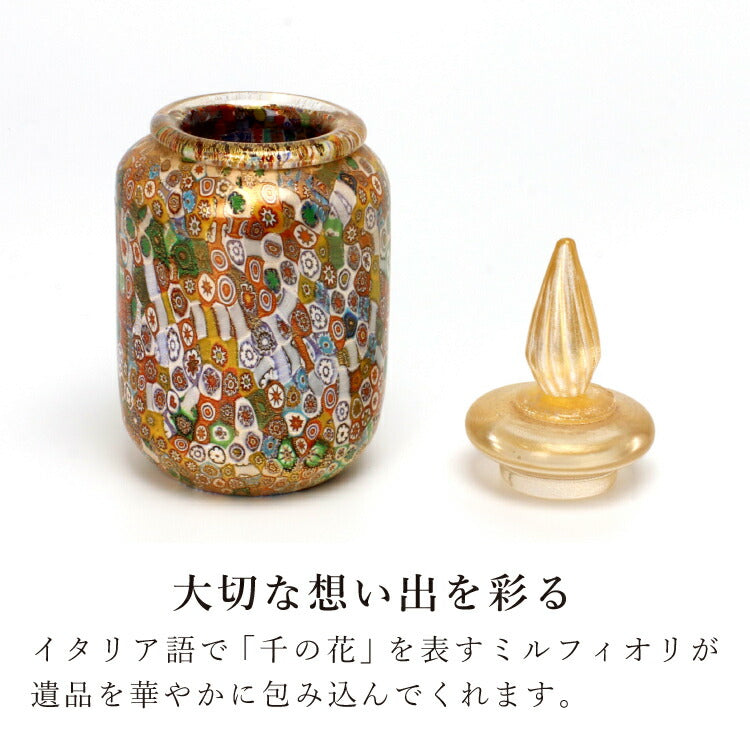 かわいいミニ骨壺です。イタリアの職人がハンドメイドで制作したヴェネツィアンガラスの骨壺。分骨や遺品を収めておしゃれに飾れます。手元供養にもおすすめです。