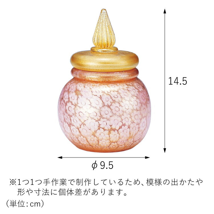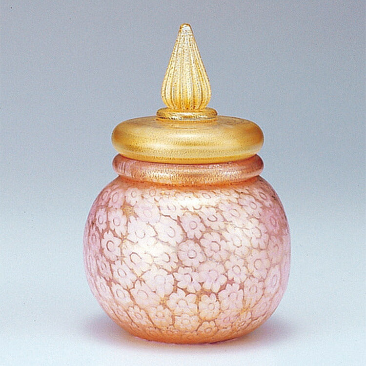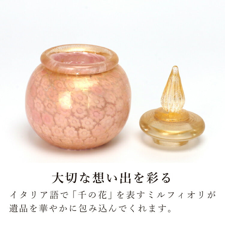 かわいいミニ骨壺です。イタリアの職人がハンドメイドで制作したヴェネツィアンガラスの骨壺。分骨や遺品を収めておしゃれに飾れます。手元供養にもおすすめです。