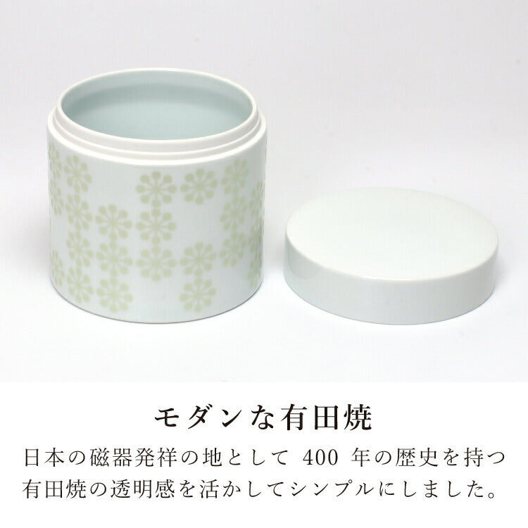 かわいい骨壺です。伝統工芸「有田焼」で制作した安心の日本製。シンプルでおしゃれな模様に彩られ、分骨用の骨壺や遺品の入れ物として大切な人をお祀りします。